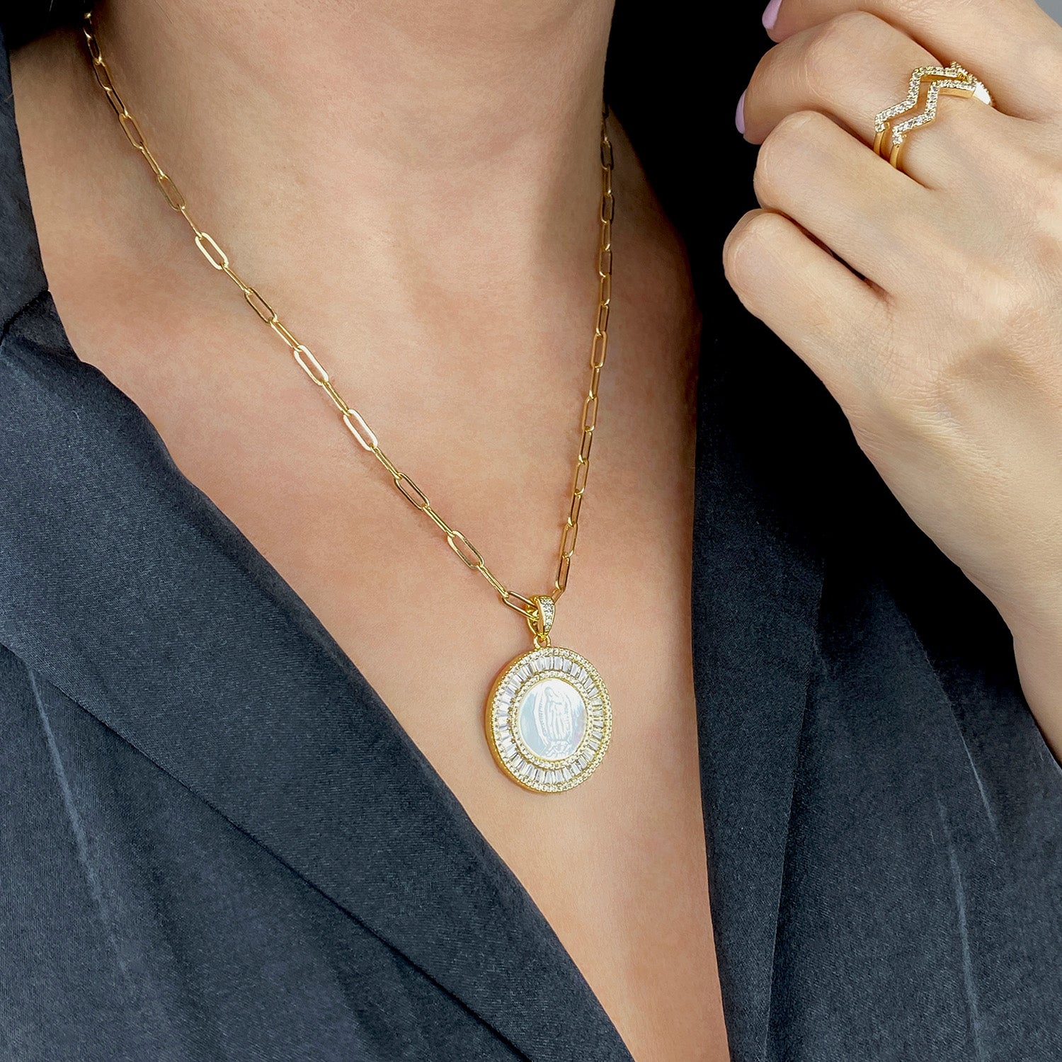 This creation has implicit in its design the glow of the sun, which surrounds everything with the energy of light. Its faceted zirconia crystals and its natural mother-of-pearl center with the carved virgin print that image on us when wearing this radiant jewel.