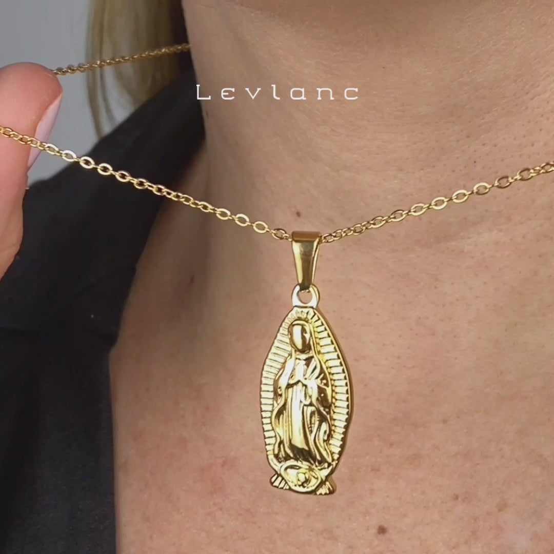 We present this beautiful necklace with a pendant alluding to the Virgin of Guadalupe in all its splendor, on this occasion carved all in gold tone.